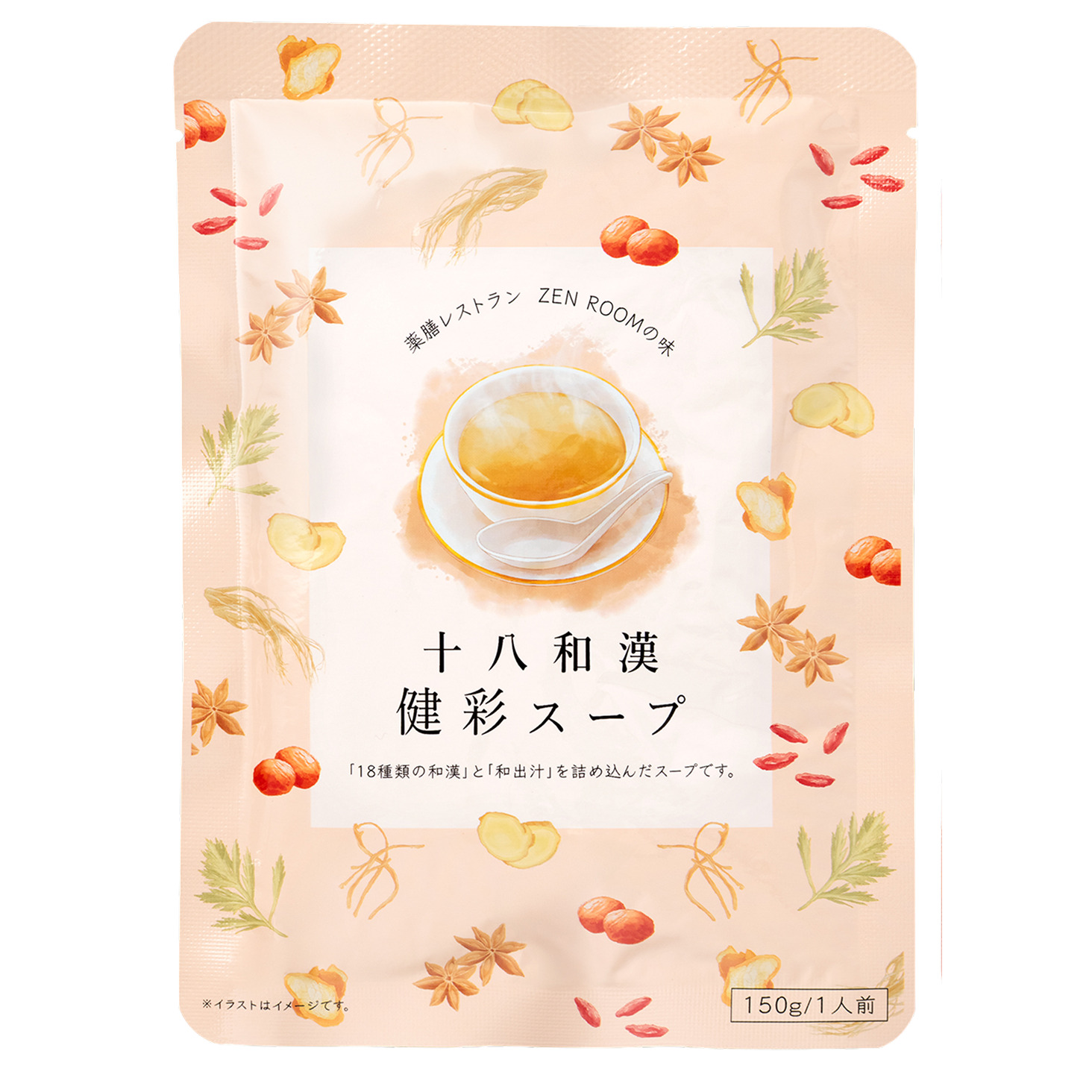 十八和漢健彩スープでは、漢方の気・血・水理論に基づいて、薬科大客員教授の漢方専門の先生よる選りすぐりの18種の和漢食材をブレンドしており、全体的なバランスとベースが上がるように調合しています。