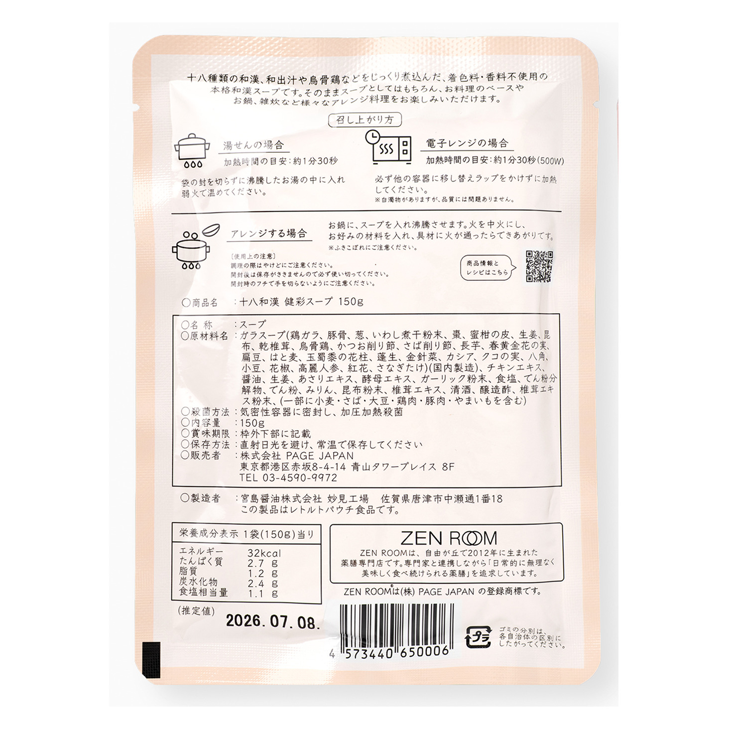 ✅国家資格薬剤師であり漢方専門である弊社顧問が配合を監修した18種類の和漢食材(陳皮・なつめ・乾姜・小豆・金針菜・クコの実・桂皮・山薬・夏草花・南蛮毛・八角・はと麦・花椒・へんず・よもぎ・さんしゅゆ・高麗人参・紅花)と国産烏骨鶏・昆布・干し椎茸・煮干し・2種類の削り節などをじっくりと煮込んで作った薬膳スープをベースに作りました。※原材料名の和漢名は以前と変わっておりますが、同じ和漢になります。(例:桂皮→カシア、山茱萸→春黄金花の実など)