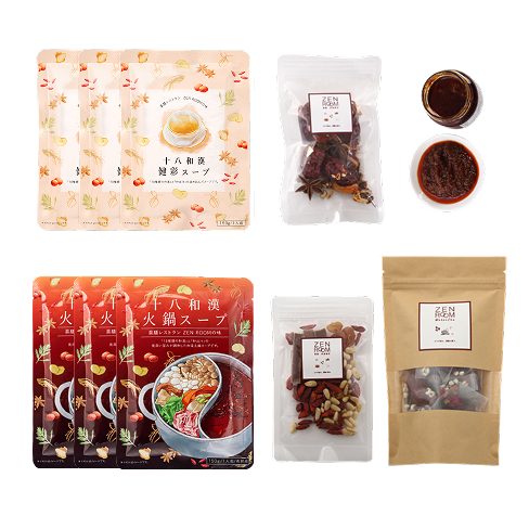 自由が丘にある薬膳レストランZENROOMが味に妥協せず何度も試作を繰り返し、開発に2年以上かけて完成した一品。国産烏骨鶏や自然食材などから丁寧に抽出した和出汁のスープベースと、十八種類の和漢や八丁味噌・香味野菜・XO醤とが絶妙に調和した味を目指しました。複数の和漢が融合した心地よい香り、自然な旨味と奥深い味わいで、今までの火鍋とは違った味わいを感じられると思います。十八和漢健彩スープと同じ薬膳スープがベースになっているので、薬膳効果も期待できます。