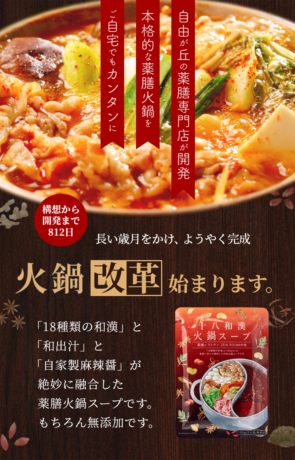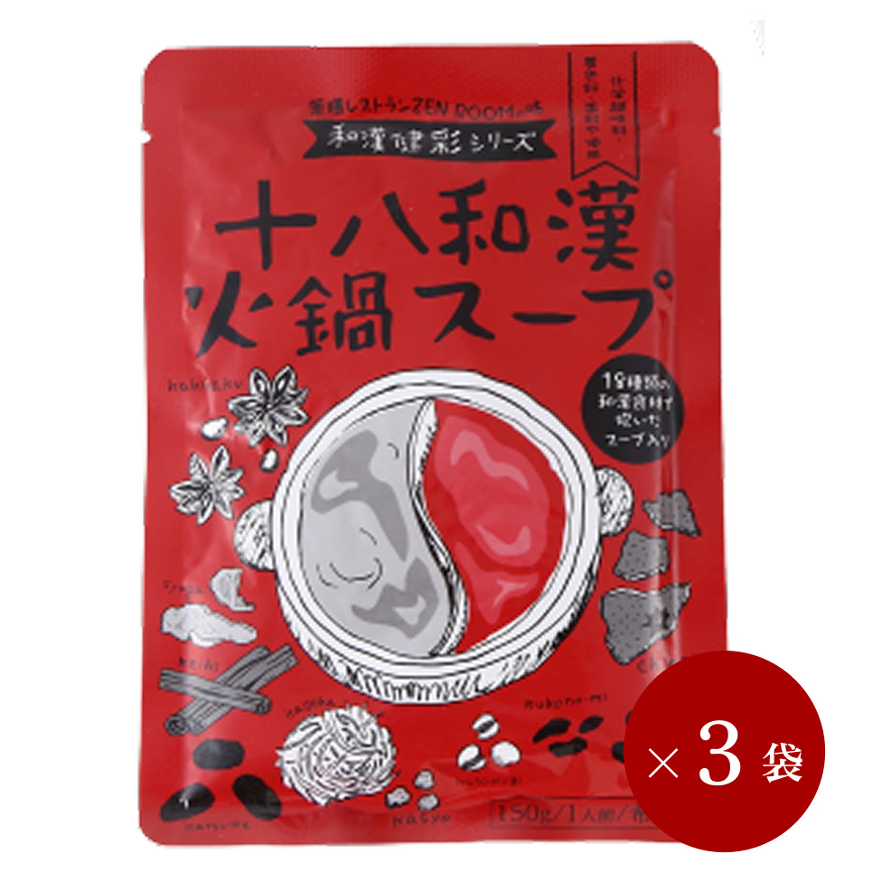 自由が丘にある薬膳レストランZENROOMが味に妥協せず何度も試作を繰り返し、開発に2年以上かけて完成した一品。国産烏骨鶏や自然食材などから丁寧に抽出した和出汁のスープベースと、十八種類の和漢や八丁味噌・香味野菜・XO醤とが絶妙に調和した味を目指しました。複数の和漢が融合した心地よい香り、自然な旨味と奥深い味わいで、今までの火鍋とは違った味わいを感じられると思います。十八和漢健彩スープと同じ薬膳スープがベースになっているので、薬膳効果も期待できます。