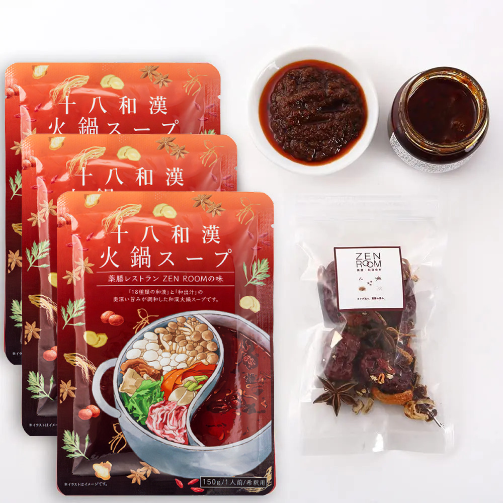 自由が丘にある薬膳レストランZENROOMが味に妥協せず何度も試作を繰り返し、開発に2年以上かけて完成した一品。国産烏骨鶏や自然食材などから丁寧に抽出した和出汁のスープベースと、十八種類の和漢や八丁味噌・香味野菜・XO醤とが絶妙に調和した味を目指しました。複数の和漢が融合した心地よい香り、自然な旨味と奥深い味わいで、今までの火鍋とは違った味わいを感じられると思います。十八和漢健彩スープと同じ薬膳スープがベースになっているので、薬膳効果も期待できます。