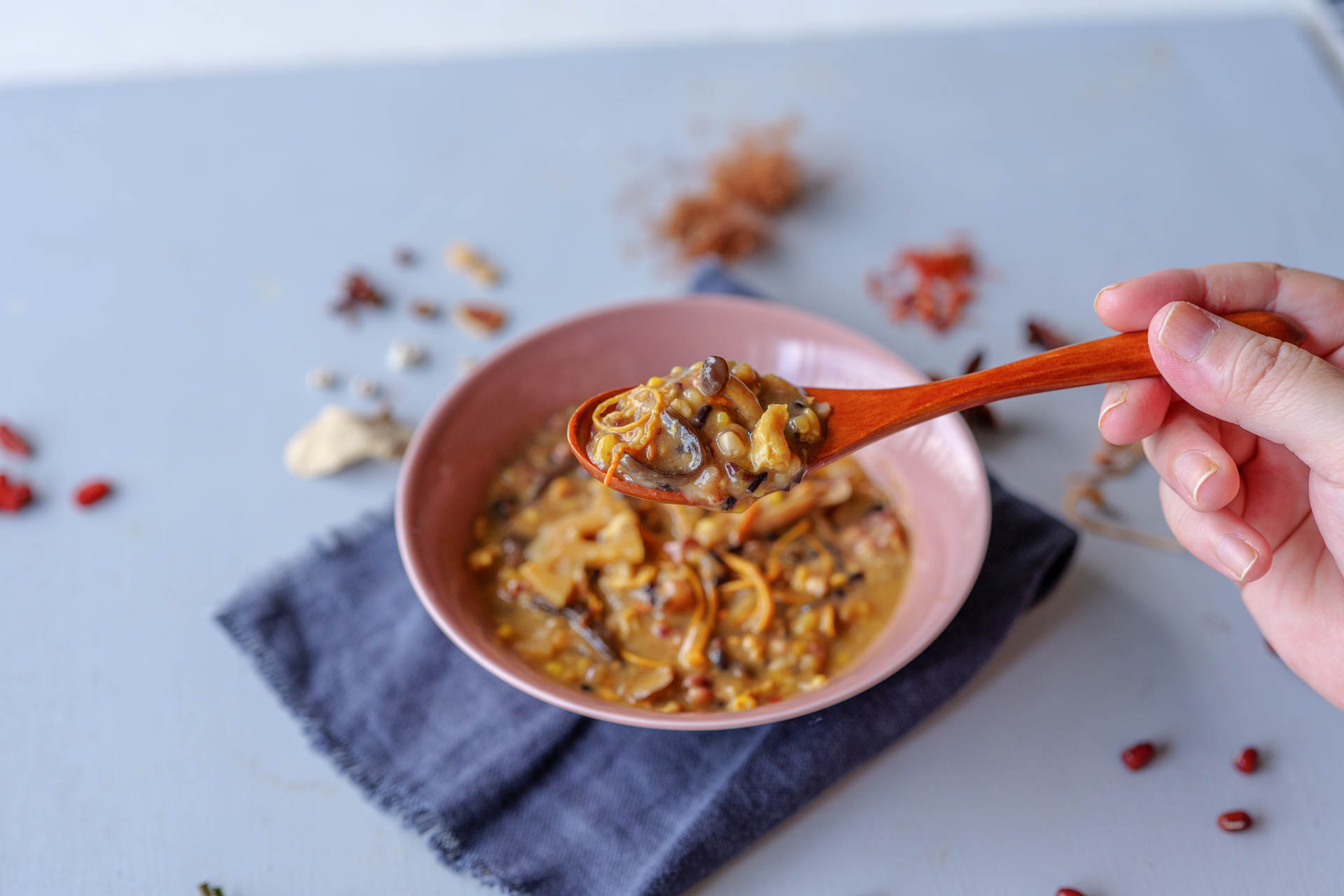 ・「十八和漢健彩スープ」をベースに、「発芽玄米やハト麦、スーパーフードのアマランサスや古代米などを含む国産の三十九種類雑穀」、そして「国産蓮根、色々なきのこ、夏草花などの薬膳食材」から栄養を余すところ無くとれる商品です。