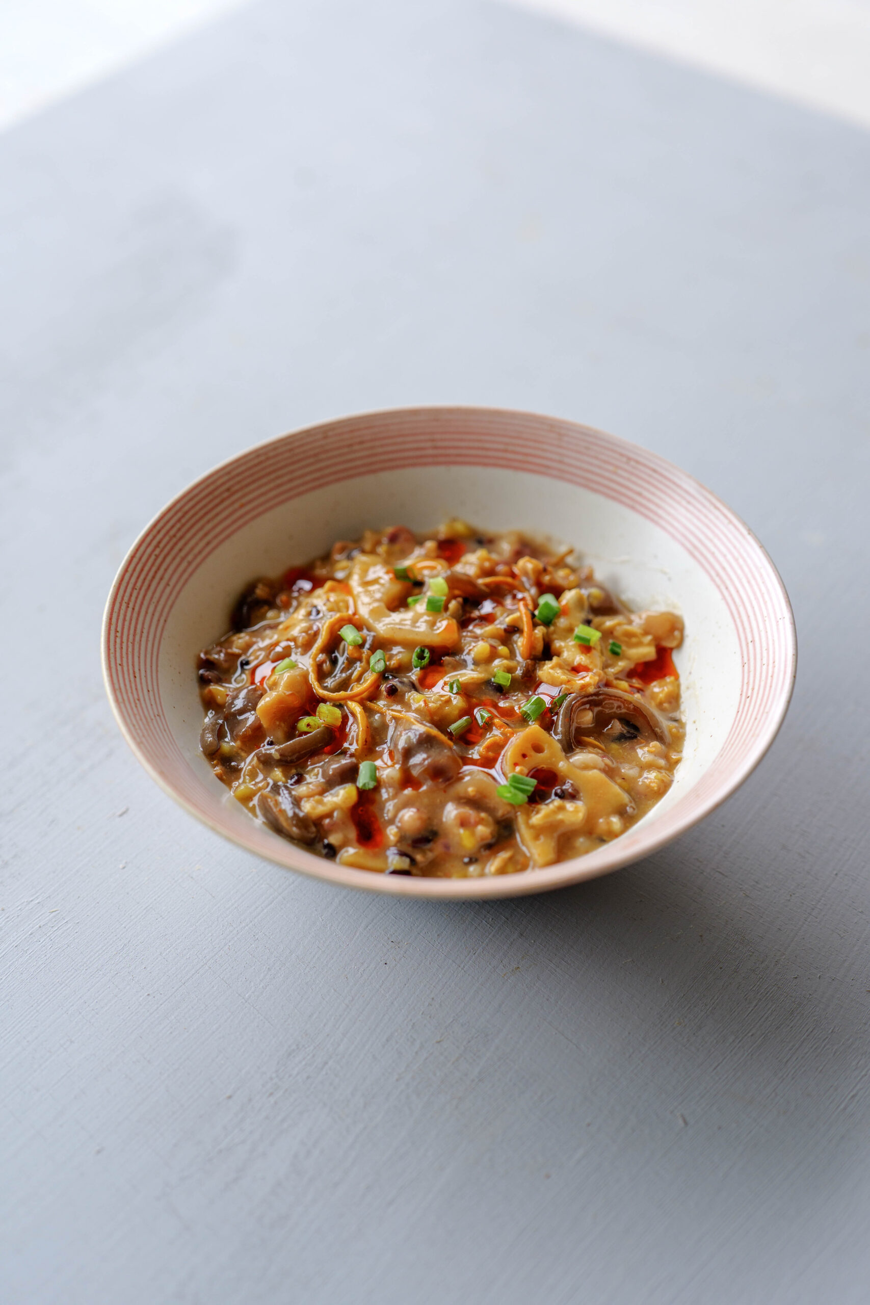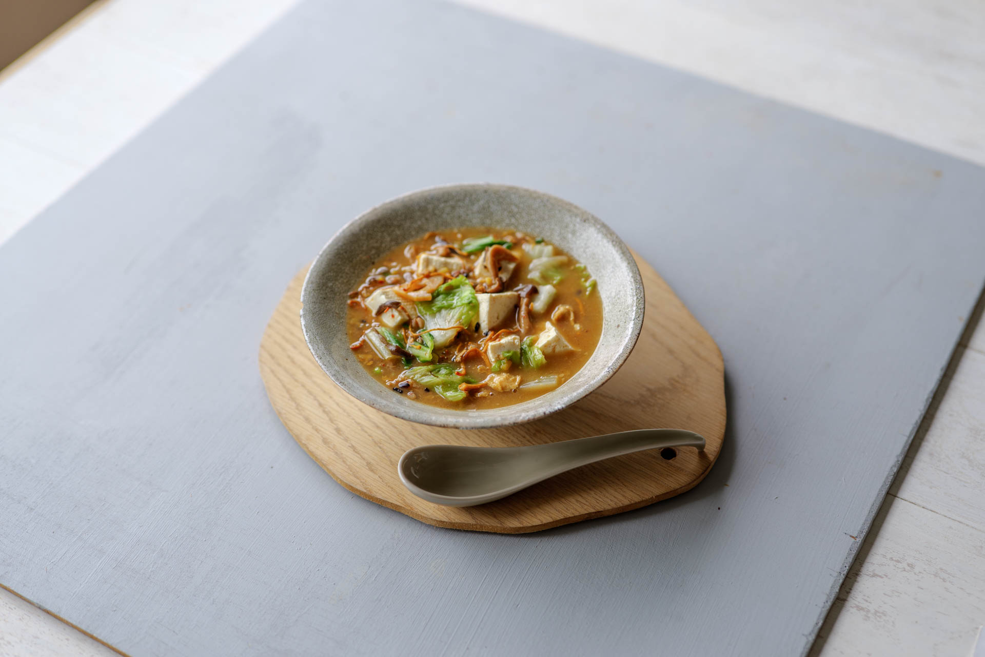 ・十八種類の和漢で作った「十八和漢健彩スープ」をベースに、花椒、XO醤、味噌、豆板醤、豆豉醤などを加えて火鍋スープに仕上げました。そちらに、高栄養価でGI値の低く栄養豊富な三十九種類の国産雑穀でリゾットにし、蓮根、黒木耳、しめじ、夏草花、鶏ひき肉などの具材がたっぷりと入っています。