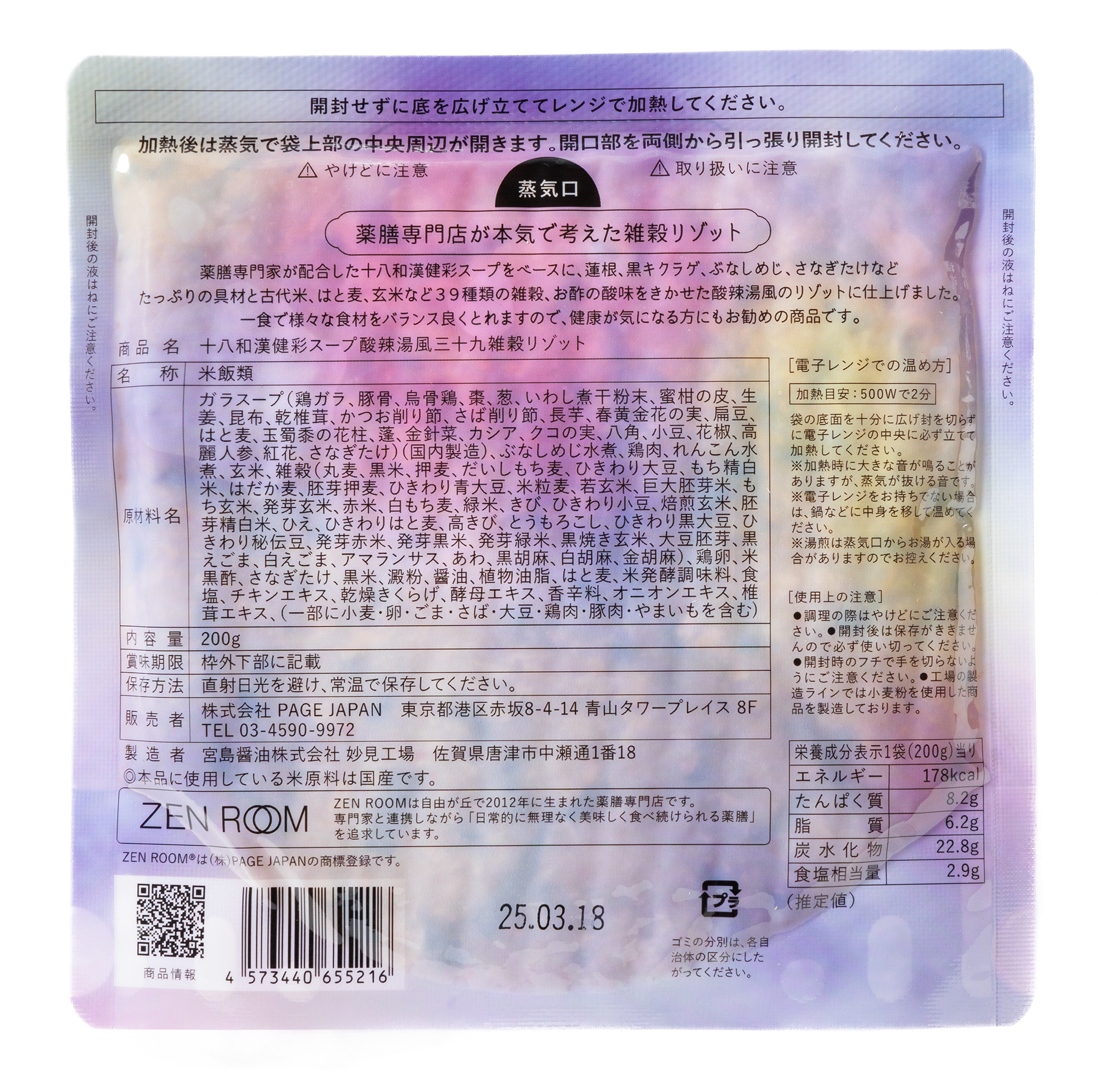| 原材料・成分 | ガラスープ(鶏ガラ、豚骨、棗、葱、いわし煮干粉末、蜜柑の皮、生姜、昆布、乾椎茸、烏骨鶏、かつお削り節、さば削り節、長芋、春黄金花の実、扁豆、はと麦、玉蜀黍の花柱、蓬、金針菜、カシア、クコの実、八角、小豆、花椒、高麗人参、紅花、サナギタケ)(国内製造)、ぶなしめじ水煮、鶏肉、野菜(サナギタケ、きくらげ、葱、生姜)、れんこん水煮、雑穀(丸麦、黒米、押麦、だいしもち麦、ひきわり大豆、もち精白米、はだか麦、胚芽押麦、ひきわり青大豆、米粒麦、若玄米、巨大胚芽米、もち玄米、発芽玄米、赤米、白もち麦、緑米、きび、ひきわり小豆、焙煎玄米、胚芽精白米、ひえ、ひきわりはと麦、高きび、とうもろこし、ひきわり黒大豆、ひきわり秘伝豆、発芽赤米、発芽黒米、発芽緑米、黒焼き玄米、大豆胚芽、黒えごま、白えごま、アマランサス、あわ、黒胡麻、白胡麻、金胡麻)、玄米、味噌、黒米、香味食用油、豆板醤、米発酵調味料、XO醤、はと麦、でん粉、てんさい糖、植物油脂、オイスターエキス、香辛料、おろしにんにく加工品、食塩、あさりエキス、酵母エキス、豆豉醤、昆布粉末、椎茸エキス粉末、生姜粉末、にんにく粉末(一部にえび、小麦、ごま、さば、大豆、鶏肉、豚肉、やまいもを含む) |